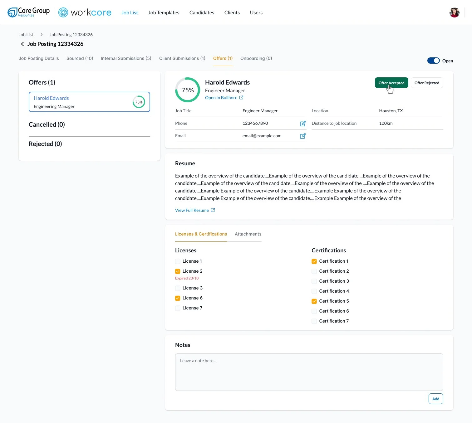 WorkCore replaced the fragmented combination of email, spreadsheets, and disconnected tools with a single platform managing the entire job lifecycle — from client job request through candidate selection, approval, and status tracking. Clients gained a transparent, real-time view into their placements, reducing inbound status inquiries and improving the overall client experience.
