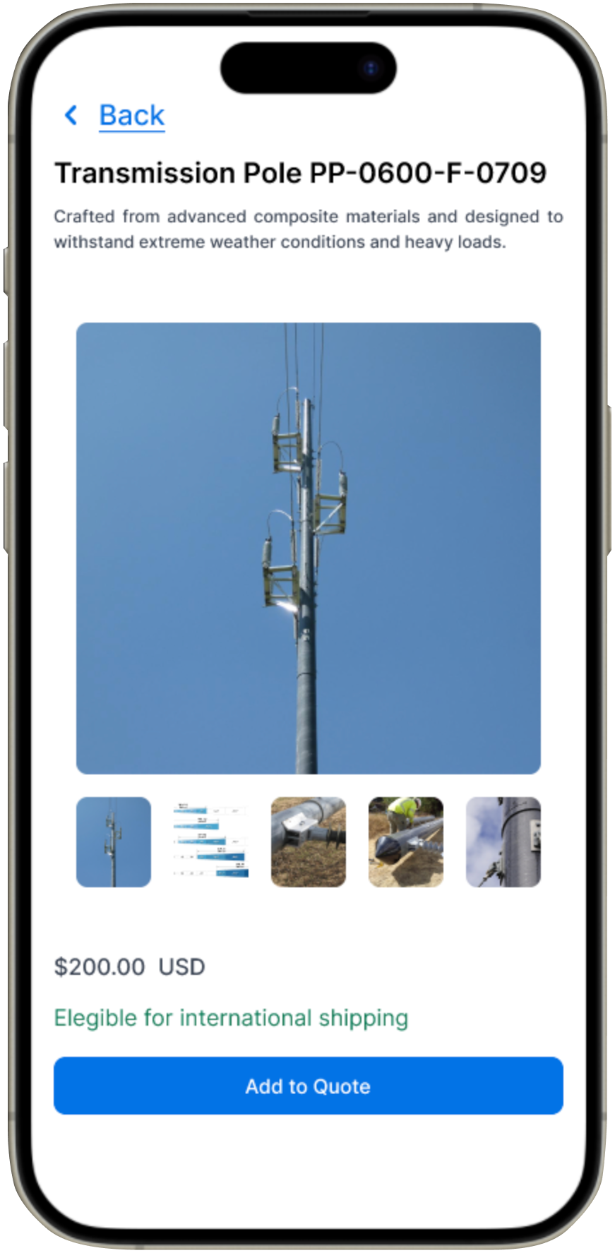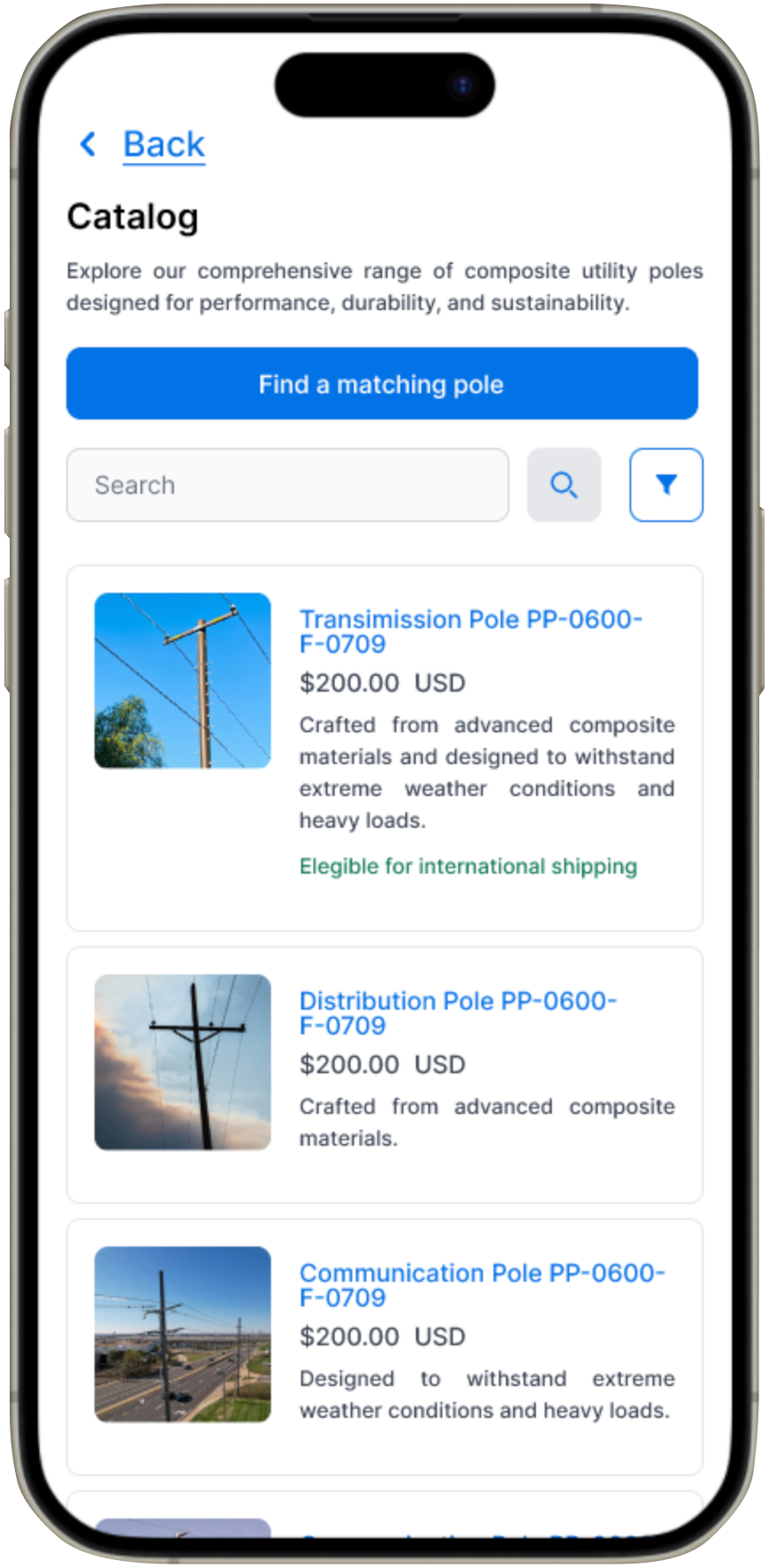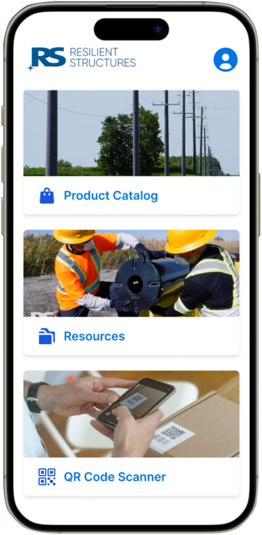 A searchable, always-current product catalog accessible directly on mobile — complete with pole and hardware compatibility filters and automatic conversion between traditional wooden pole specifications and RS Technologies' composite Wood Pole Equivalents.